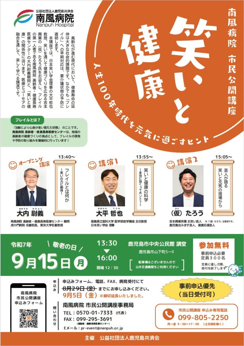 【告知】9月15日 南風病院 市民公開講座「笑いと健康」を開催いたします。→9月5日まで申込み締切延長