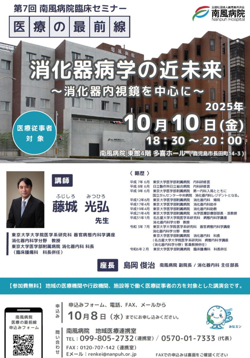 10/10 医療の最前線「消化器病学の近未来~消化器内視鏡を中心に~」を開催いたします。(医療従事者対象)